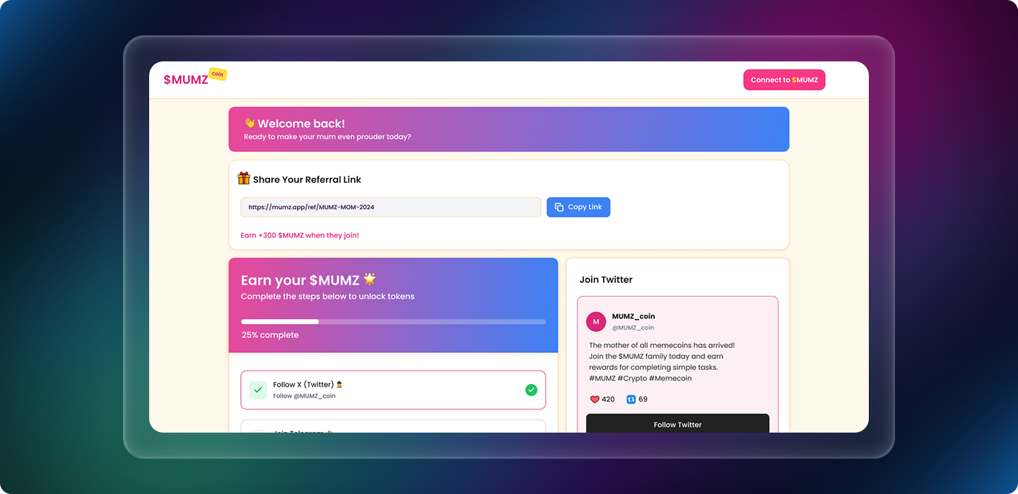 Users earn $MUMZ through simple social missions like sharing, quizzes, and referrals — turning engagement into value.