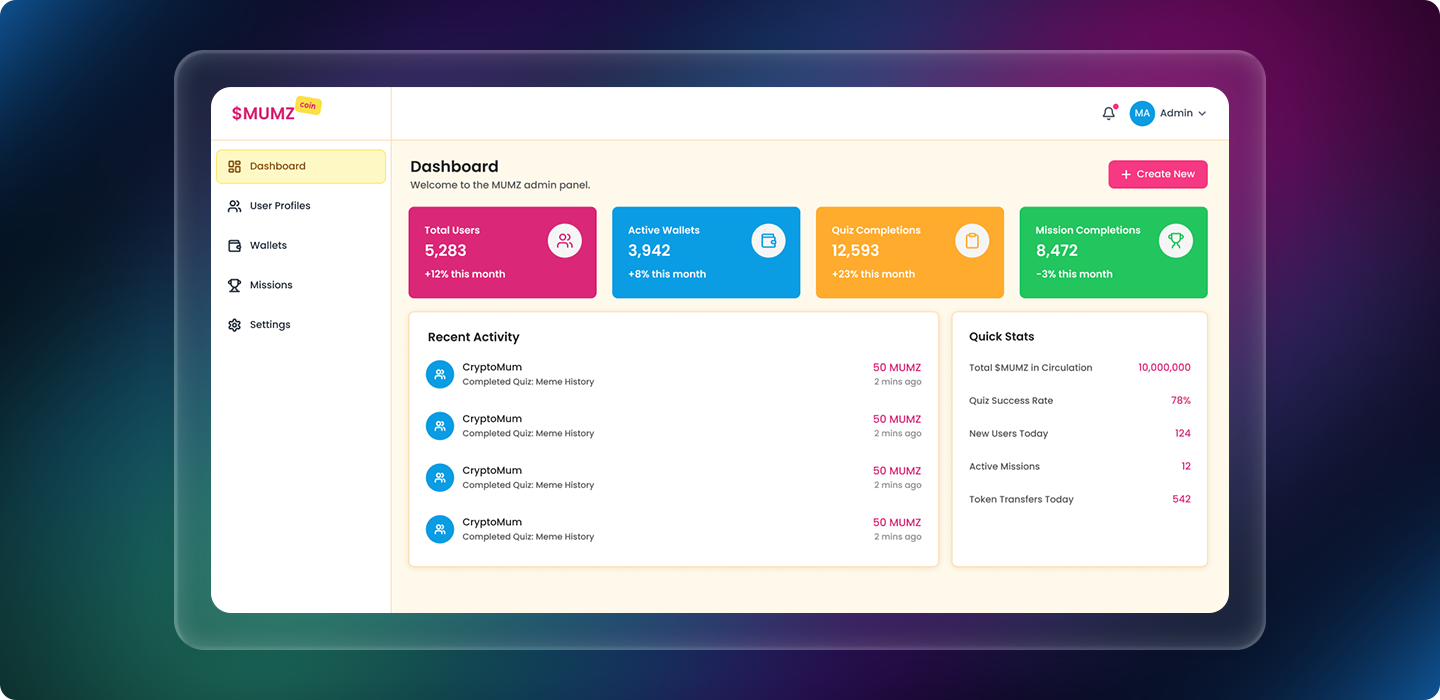 Comprehensive backend dashboard showing total users, wallet activity, mission completions, and performance metrics.