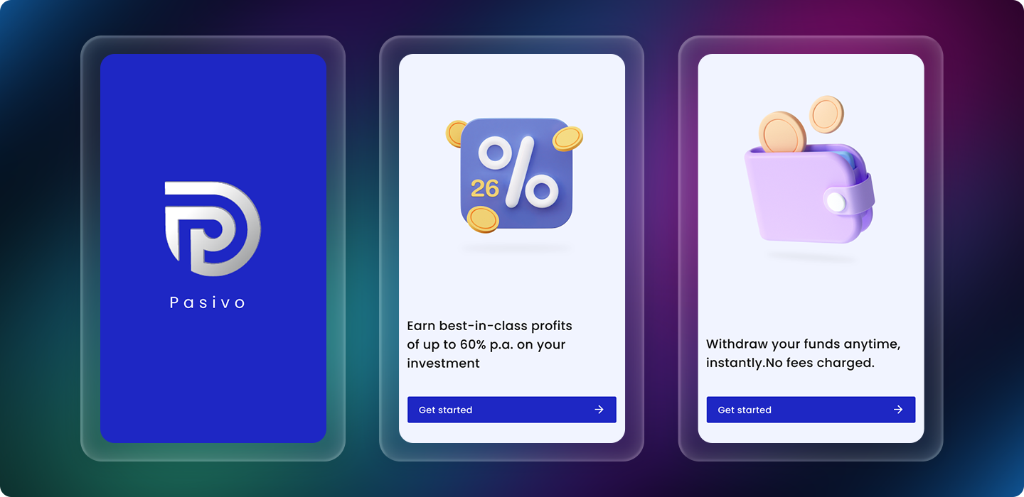 Intro screens highlighting investment returns, instant withdrawal, and zero-fee benefits through simple 3D visuals.