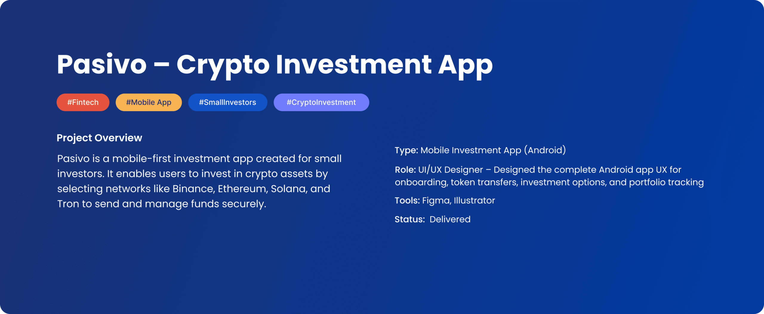 - Helped Pasivo establish itself as a modern, secure, and high-yield fintech platform for crypto investors.
