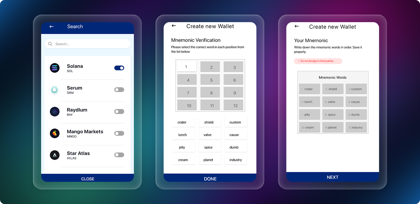 Easy setup process for creating wallets with mnemonic verification and multi-network token management.