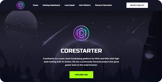Token launchpad website showcasing staking, IDO pools, and roadmap through clean Web3 visuals.