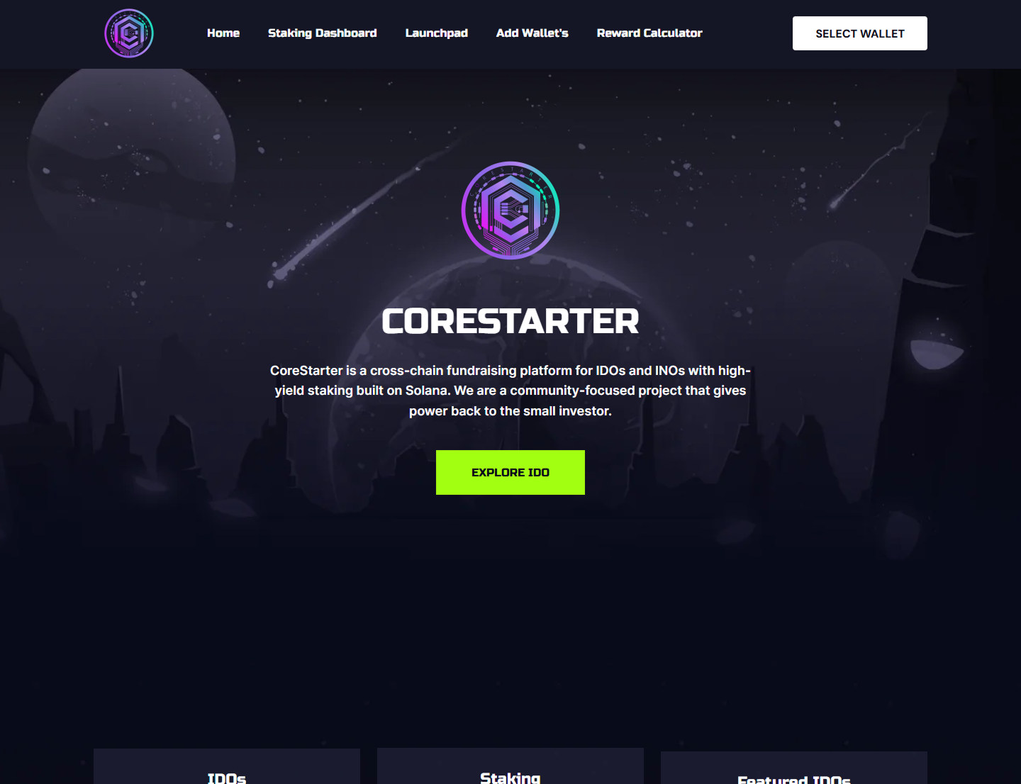 I designed the website for CoreStarter, a cross-chain IDO launchpad on Solana. The platform enables fundraising for IDOs and INOs while offering high-yield staking, ensuring a seamless and user-friendly experience for investors.