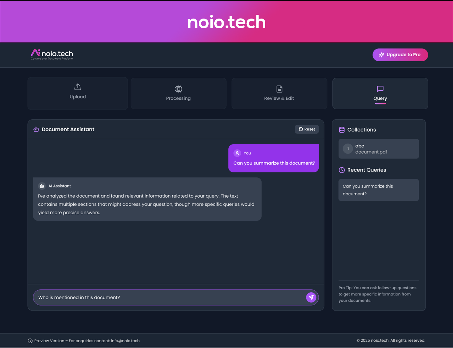 Designed an end-to-end OCR document platform with both dark and light themes, enabling users to upload documents, extract text, review and edit content, organize files into collections, and query documents using an AI assistant. The platform focuses on a clear, guided workflow with strong feedback at every step, from upload to AI-powered querying.